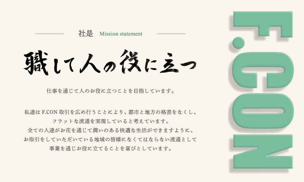 | 2001年(平成13年)7月 | F.CON創立 花き電子取引専門会社としてスタート 大阪鶴見花き卸売市場の仲卸業務を開始 (株)なにわ花いちば、(株)JF鶴見花き取引開始 |